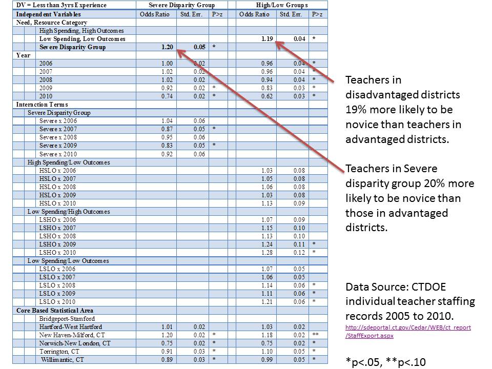 If reformy advocates really don’t believe that money has anything to do with improving schooling quality, then why do charter advocates in Connecticut (and elsewhere) push so hard for substantial increases in funding ($2,600 per pupil in CT)? Yet the underfunded high need districts stand to gain far, far less under current proposals (only about $250 per pupil). Funding those districts appropriately comes with a higher price tag than increasing charter funding because they serve a lot more students and far more needy students than CT charters. The persistent inequities faced by these districts are glaring… right down to the delivery of basic curricular options, especially in the neediest, least well resourced districts. Larger class sizes… Advanced and enriched curricular options… Teacher Salaries… Concentration of novice teachers.