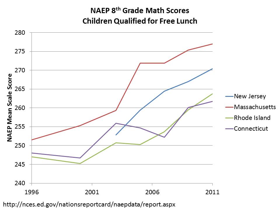 Recently, I responded to an absurd and downright disturbing Op-Ed by a Connecticut education reform organization that claimed that Connecticut needed to move quickly to adopt teacher evaluation/tenure reforms and expand charter schooling because a) Connecticut has a larger achievement gap and lower outcomes for low income students than Massachusetts or New Jersey and b) New Jersey and Massachusetts were somehow outpacing Connecticut in adopting new reformy policies regarding teacher evaluation. Now, the latter assertion is questionable enough to begin with, but the most questionable assertion was that any recent policy changes that may have occurred in New Jersey or Massachusetts explain why low income children in those states do better, and have done better at a faster rate than low income kids in Connecticut. Put simply, bills presently on the table, or legislation and regulations adopted and not yet phased in do not explain the gains in student outcomes of the past 20 years.