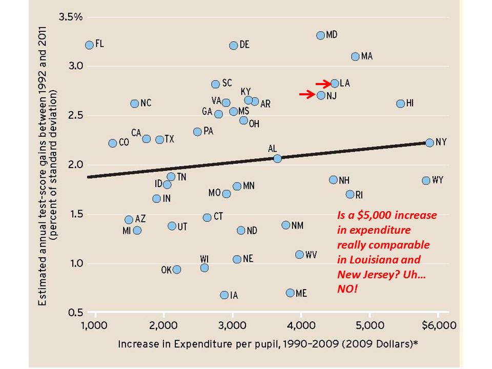 The bottom line however, is that either scatterplot is pretty meaningless, with mine arguably slightly less meaningless than the original! But neither really useful for making any bold statements about state aggregate spending and outcome gains. Again, in my policy brief on Money Matters, I explore these issues in much greater detail. Referring to more rigorous studies attempting to link spending and outcome measures, I explain: