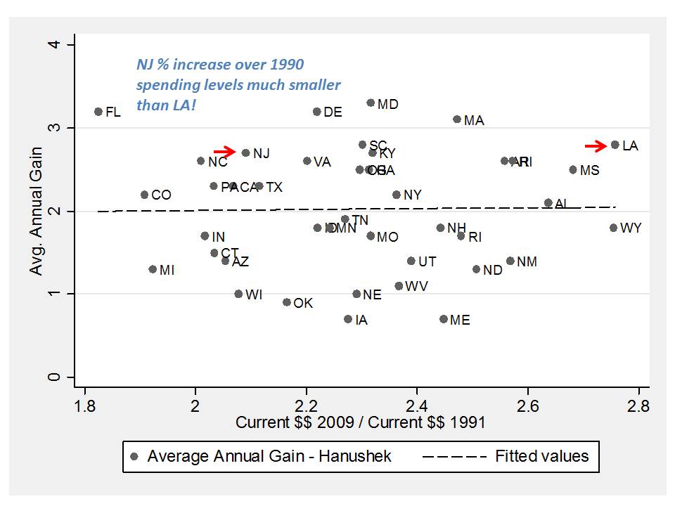 Hmmm… as it turns out, New Jersey spending really didn’t increase much as a percent over the base year. Louisiana, however, did. In fact, Louisiana actually had among the highest growth among states. Well then, that would mean that New Jersey really kicked some butt! Not much spending increase at all… and some pretty damn good outcome gain!