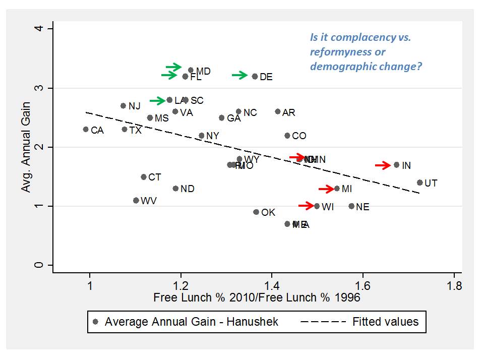 Note that Hanushek, Peterson and Woessmann make a big deal about the great performance of Louisiana, Delaware, Maryland and Florida and the particularly sucky performance of Michigan, Indiana, Minnesota and Wisconsin. Uh… wait, weren’t Indiana and Michigan awesome above – for getting those paltry outcome gains for little or no additional investment? Yeah… but now they suck. Really… suck… because… they’re complacent… and not reformy. As it turns out, the states referred to as generally awesome by the authors also had generally less increase in % low income students.