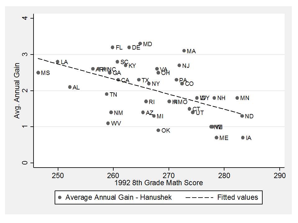 While the authors acknowledge that starting performance levels are associated with outcome change, they go to great lengths to blow off this issue, arguing a) that it explains a relatively small share of the variation (uh… only about a quarter of it… which is actually quite large for this type of data/analysis) and b) that other plausible explanations involving the southern reformyness vs. midwestern complacency dichotomy may explain much of the rest of the difference? (without any evidence to support this notion!).