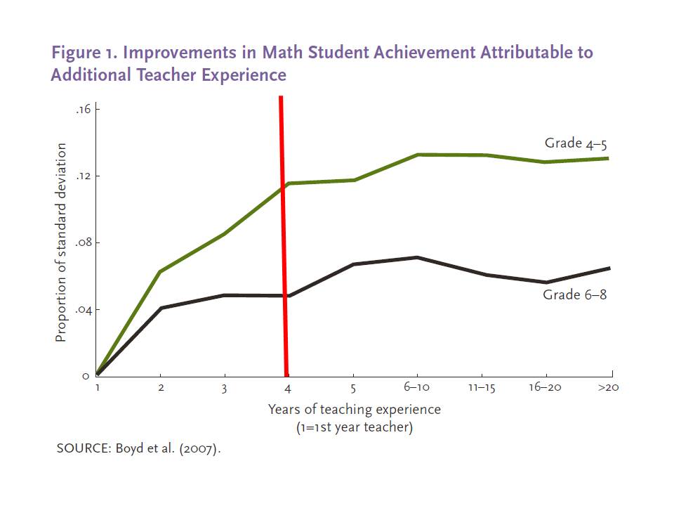 Here’s a graph from a Calder Center report summarizing the student test score gains in relation to teacher experience.