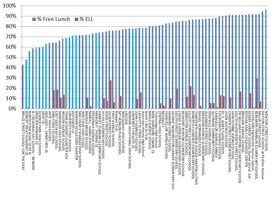Here’s my usual starting point – % free lunch and % ell by school for schools with their city of location as Newark.