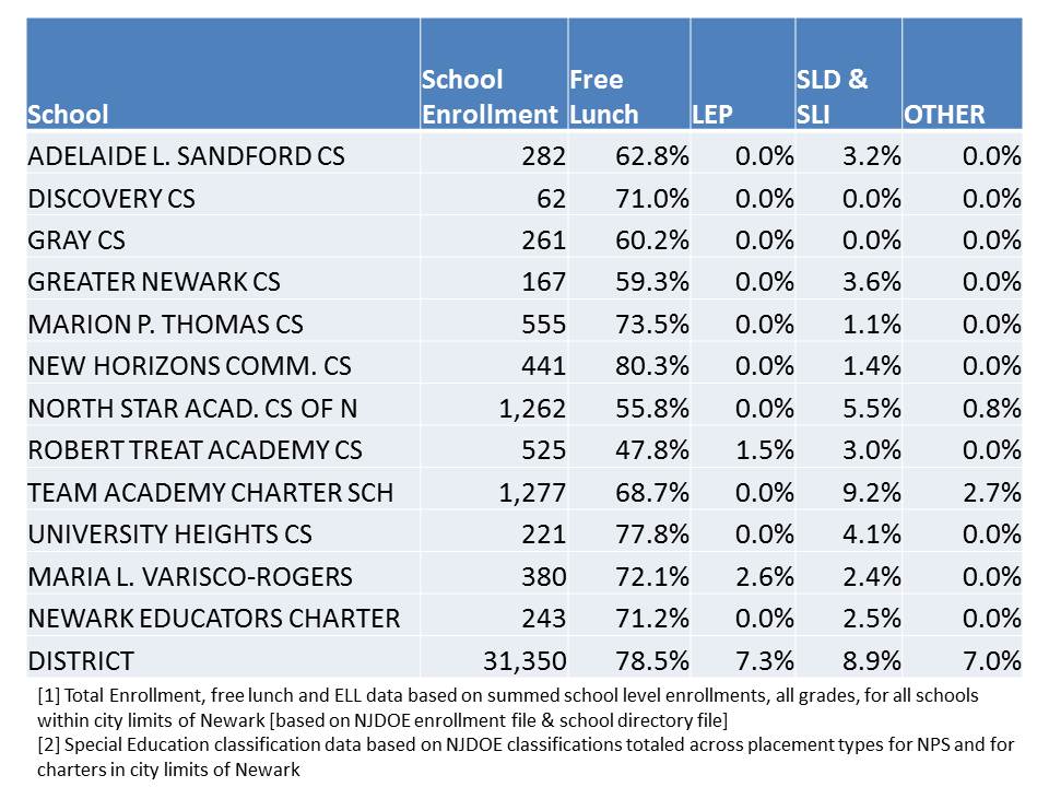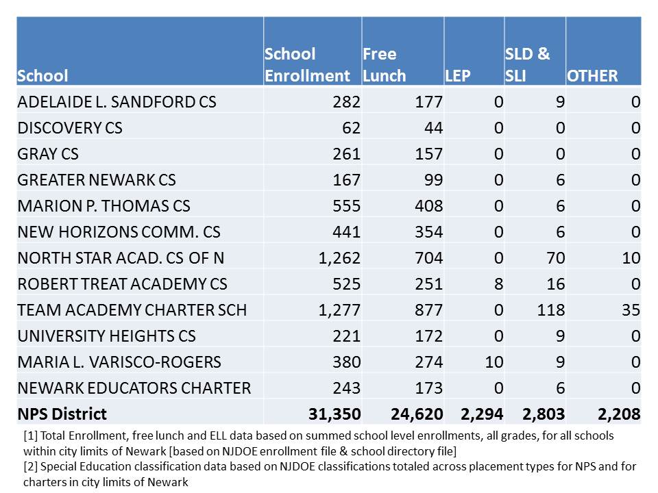 *Note that if we look at the district enrollment data, NPS enrollment is actually greater than the figure above, and greater in each other category. Some of the difference is a function of special education out of district placements, where many of those students are both disabled and low income. District reported totals are enrollment = 33,279, free lunch = 26,320, ELL = 2,665 (leading to slightly higher disadvantaged shares than above). see: http://www.nj.gov/cgi-bin/education/data/enr11plus.pl