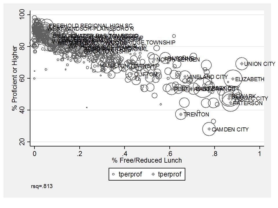 Figure 4 suggests that Camden and Trenton are actually a) higher poverty than Elizabeth (and Camden higher than Union) and b) perform more or less where they are expected to [somewhat below… as opposed to well below]. This is an interesting contrast that adds some support to my speculation above that these very high poverty cities may in fact be understating their poverty rates in their free/reduced lunch data. Indeed, there may be some overstating in Union and Elizabeth, but neither “popped” substantially above the curve in the previous charts.