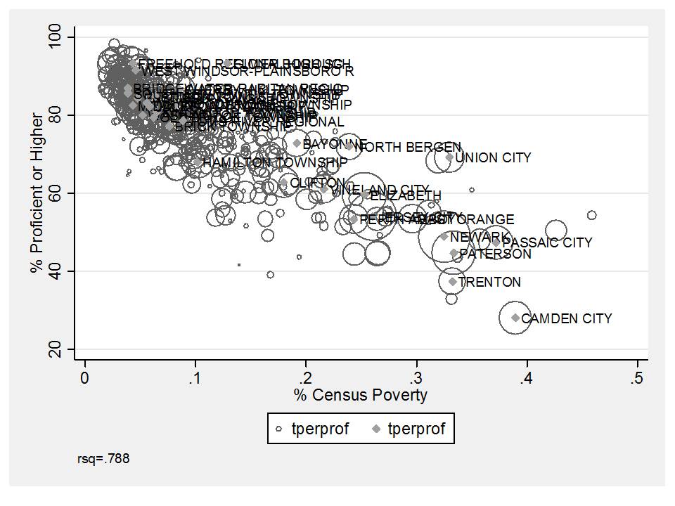 Census poverty rates, while capturing a unique story of difference between Camden and Trenton vs. Union and Elizabeth do slightly less well at explaining variations in proficiency rates, making the free/reduced count preferable in this regard.
