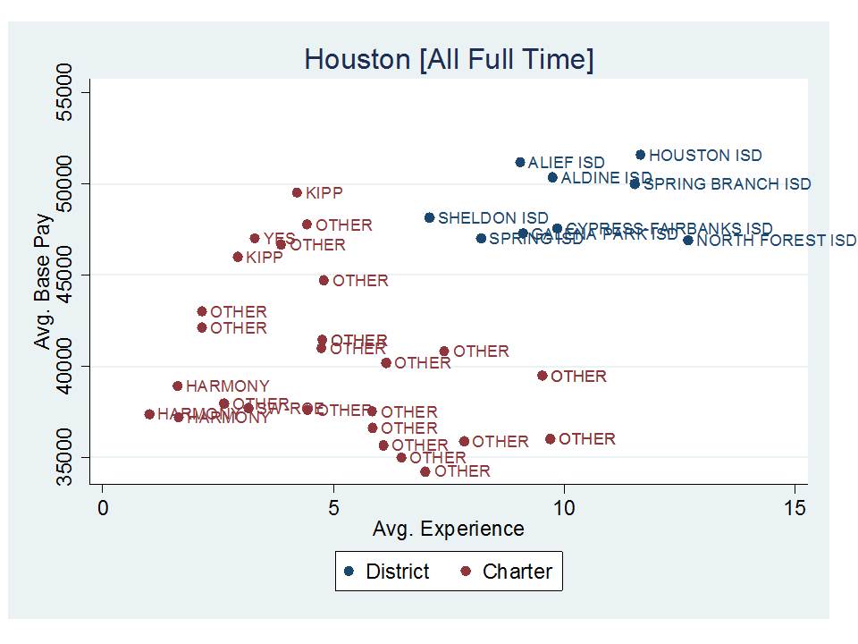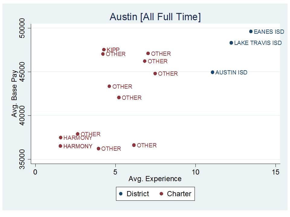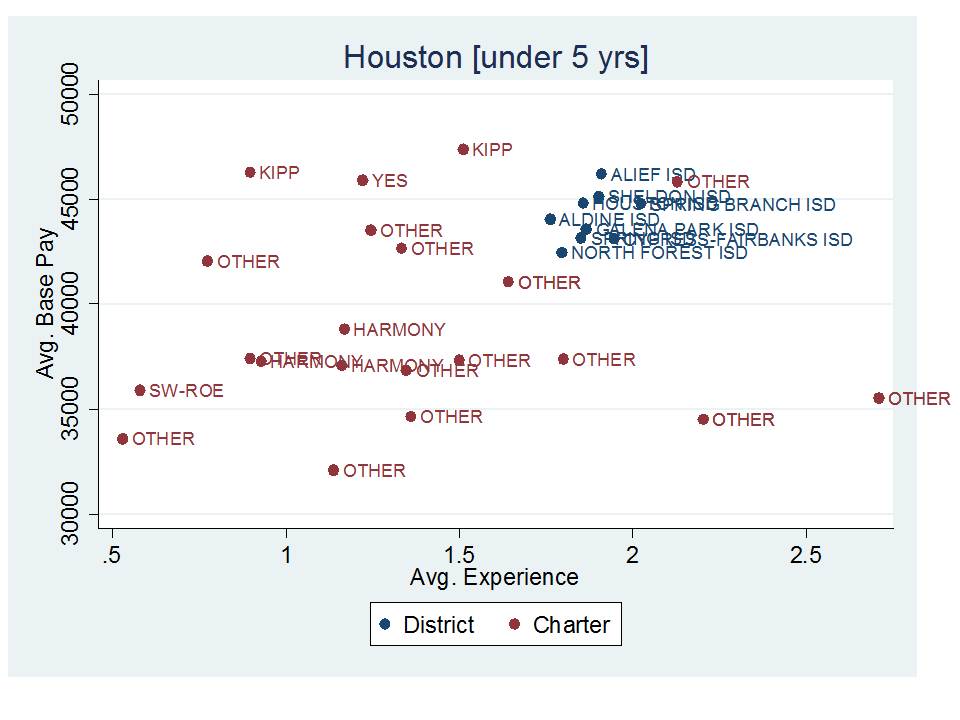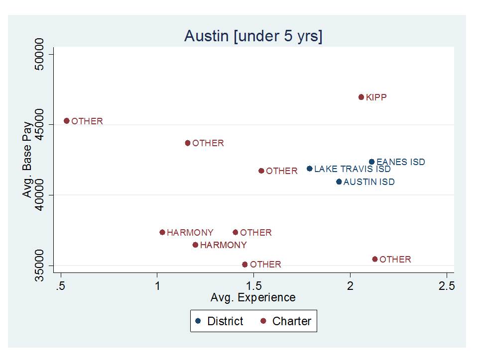 Figure 2 through Figure 4 show the average school level wages for teachers in Texas district and charter schools in Houston and Austin. Notably, Harmony schools have very low average experience levels and also have very low average salaries. They also have low average salaries even given their low average experience levels. Is it any wonder they suffer a teacher supply problem? Especially with a curricular emphasis on math and science? And especially in tech heavy urban centers.