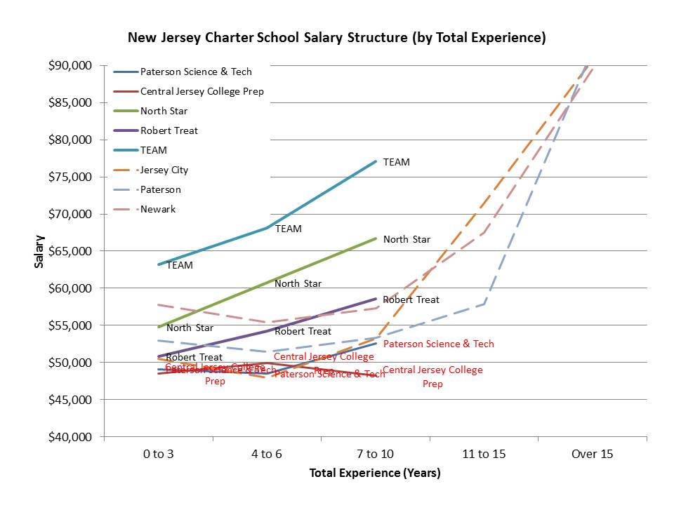 For this graph and a following graph on NJ Gulen schools, I use teacher level data from multiple years to estimate a model of teacher salaries as a function of experience and degree level. Then I project out the predicted salary for teachers at each experience level holding degree levels constant. This gives me a picture of how teacher wages compare between schools for comparably educated teachers and at different experience levels.