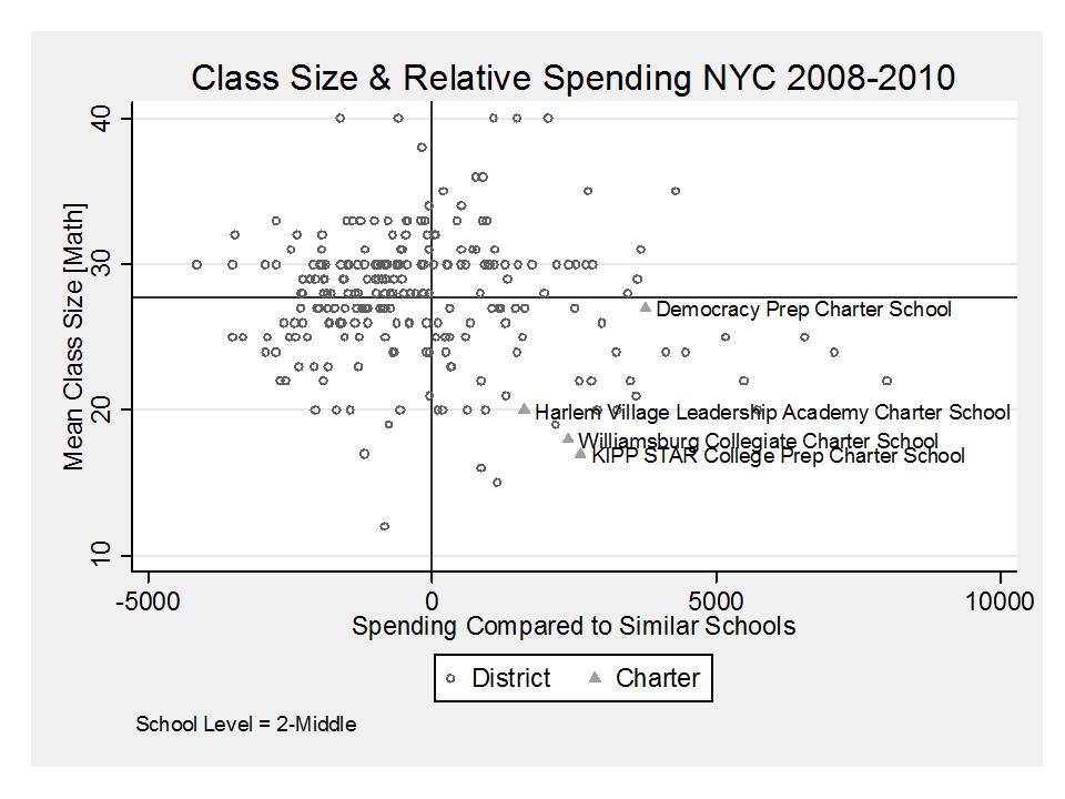 As a bonus, I also have this slide on class sizes (8th grade math) for NYC schools serving 8th grade. I’ve related class size to spending here, showing that each of these higher spending charter chains (except for Democracy Prep) seem to be leveraging at least some of that funding to provide much lower class sizes.