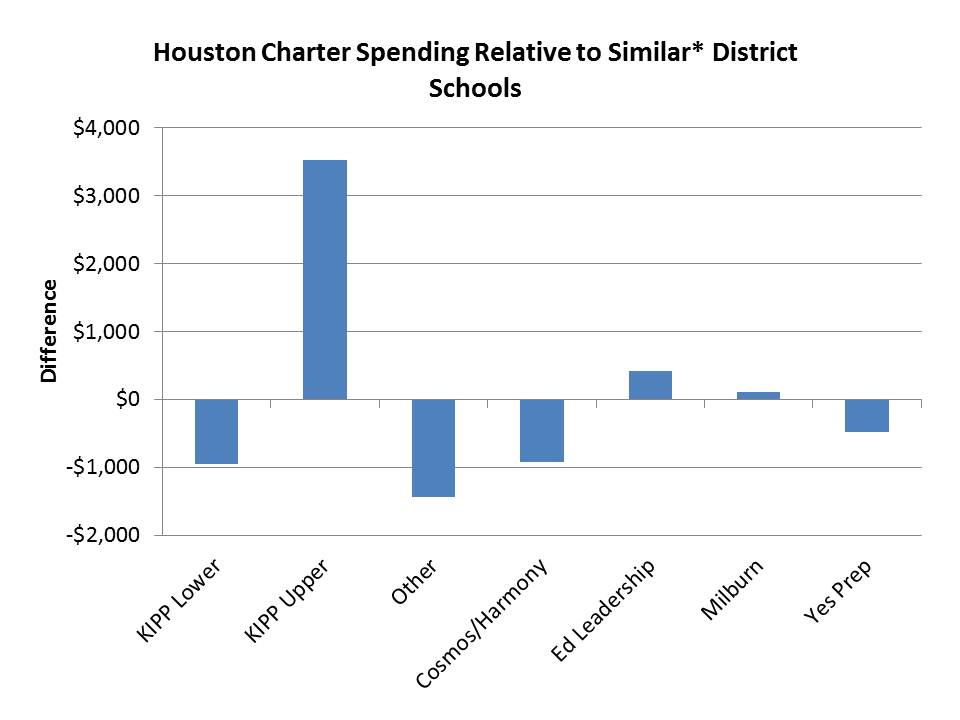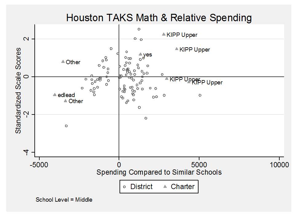 Figure 6 shows the average spending and outcomes for schools in Houston. Among KIPPs, all spend much more than district schools and two have higher than average outcomes and the other two have average outcomes. The Yes Prep school in the sample spends more and has higher than average outcomes. Meanwhile, some other charters spend less and do less well, and one spends less and has somewhat higher than average outcomes. Notably, however, the population characteristics of these schools were also mixed. It may be the case that these KIPP schools have more needy populations than the average district school, and on average are doing average to better. That’s not bad. However, we must acknowledge they are doing this at a much higher price! Similar kids? Mixed (more low income, fewer ELL or special ed). Better outcomes? Also mixed, but okay. Less money? No, actually more… a lot more.