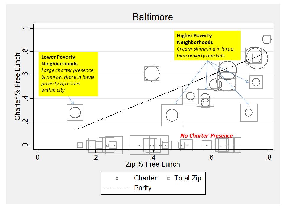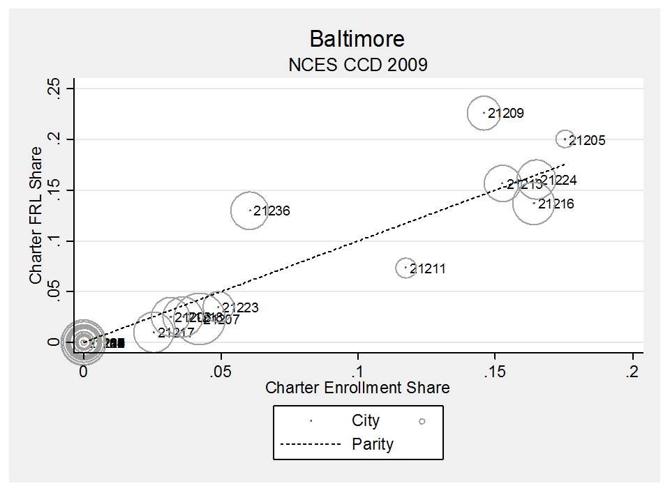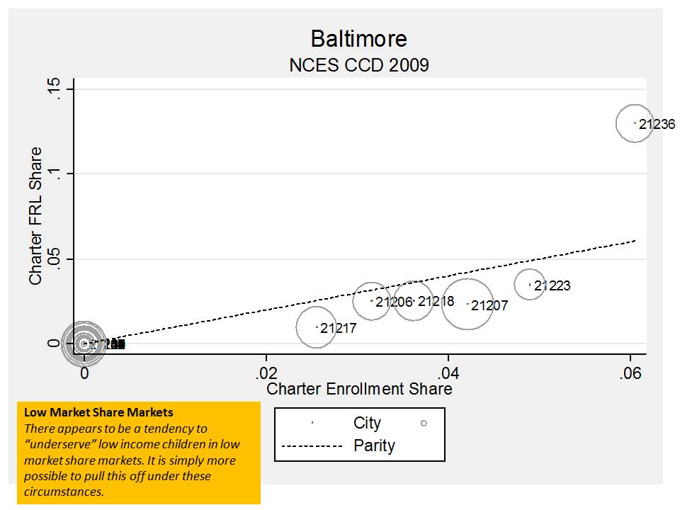 Here’s Baltimore (I always get asked to include Baltimore… so here it is). And Baltimore’s low charter market share zip codes display what seems to be a typical pattern, with most having charter sectors that serve fewer than expected low income children (again, those qualified for free lunch).