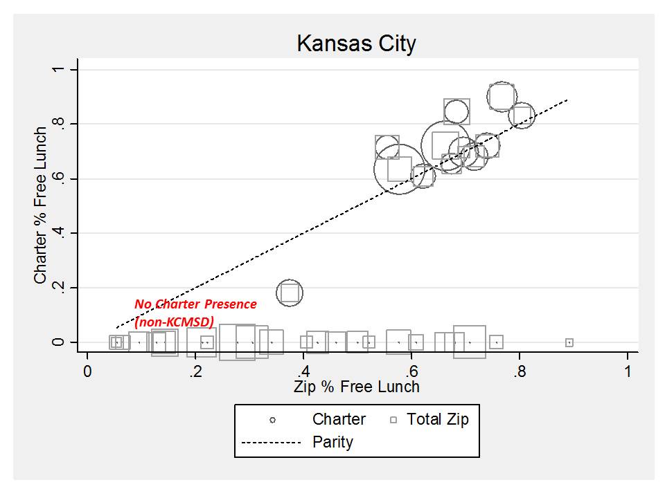 But even Kansas City has some issues regarding the extent to which charter schools actually reach the lowest income neighborhoods in the city. In fact, a really cool Kauffman Foundation (Charter Advocates for the most part) report about a year ago pointed out how charters had largely established around the edges of the poorest neighborhoods but were not embedded in those communities. I discussed that report here: https://schoolfinance101.wordpress.com/2010/10/30/biddle-me-this-or-flunkout-nation/