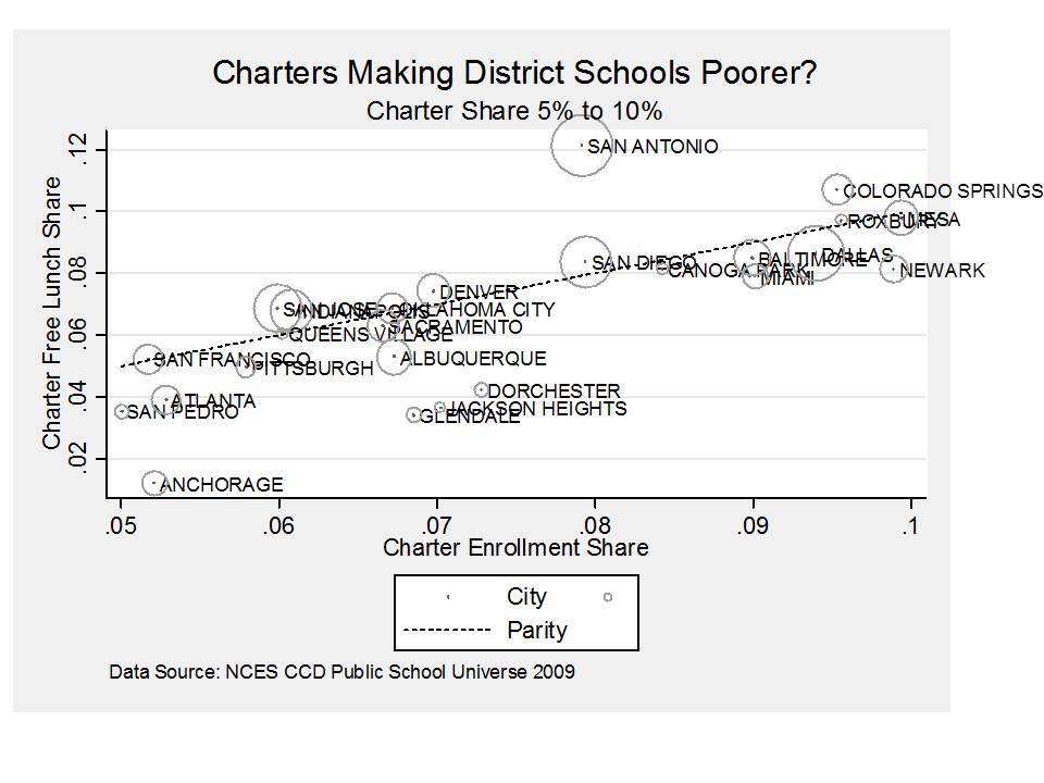 In lower middle-market cities, things seem to even out a bit, but many are still below the parity line, including Newark, which I have pointed out on many occasions. San Antonio charters have a higher free lunch share than the districts serving San Antonio.