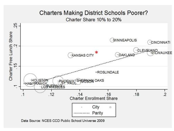 In larger market share cities there seems to be even greater parity, and in Minneapolis and Kansas City it would appear that the charters on average are serving more lower income children than the district schools within the city limits. But, some caveats are in order here…