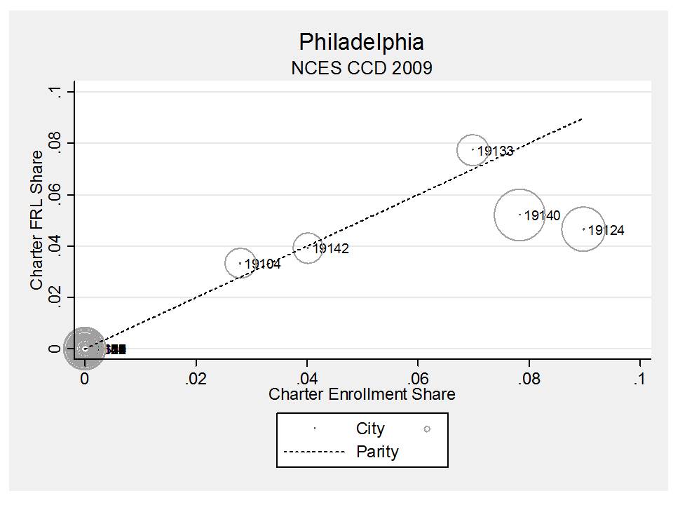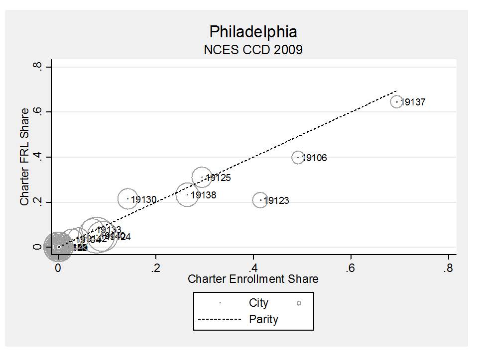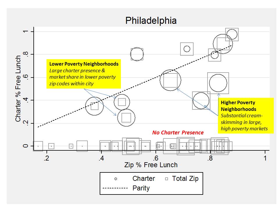 So, if there is a large square, with a small circle in it, that’s a high total enrollment zip code, with relatively low charter enrollment. If there’s a smaller square with large circle, that’s a smaller zip code market with a large charter enrollment. All of those squares along the bottom are zip codes with no charter market share at all. In Philadelphia, there exist several high poverty zip codes with no charters. And there are some large high poverty zip codes with large charter market shares – BUT… where those charters are underserving low income children.