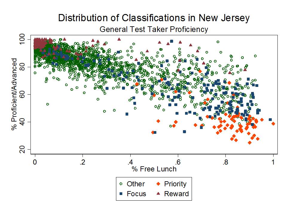 This figure shows just how much the demographic differences represented above matter with respect to student achievement, and specifically how much school demography continues to dictate the performance classification of schools under the NJDOE waiver plan.