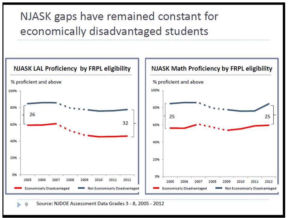 Again, part of the message being presented in the state of the schools address is that New Jersey in particular has failed its low income children – as indicated by the suspect, over time proficiency rate graphs presented above. These graphs are presented as coupled with the funding/resource graphs to imply that funding is clearly unhelpful at best and harmful at worst when it comes to fixing the achievement gap.