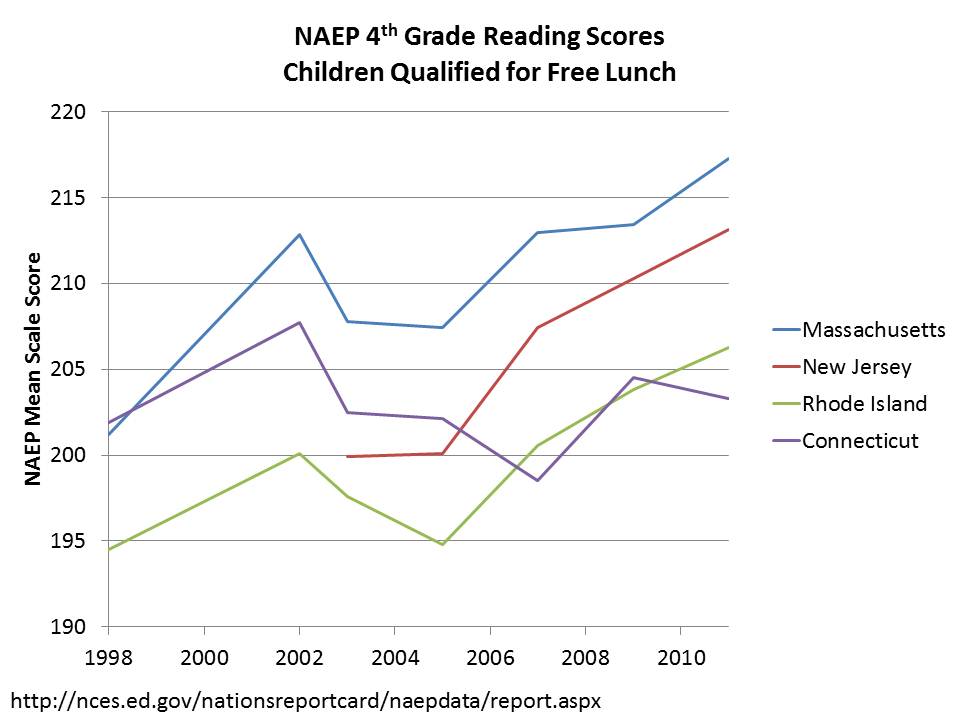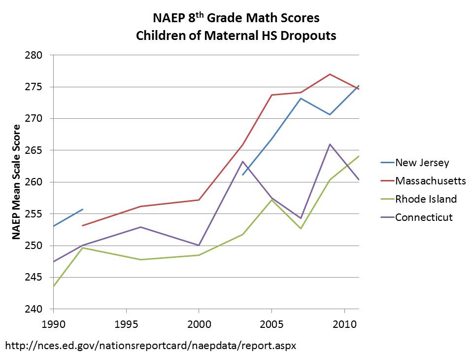 As I’ve written on this blog before, New Jersey has made substantive gains in recent decades for low income children. Further, to make comparisons of achievement gaps, one must focus on the most comparable measures and most comparable settings. In one recent blog post, I compared Massachusetts, Connecticut and New Jersey – which in terms of income distributions and the characteristics of those above and below the Free/Reduced Income thresholds are most similar. The following graphs show that children of HS dropouts and low income children in NJ and MA have both higher levels of performance and have outpaced the gains in performance of similar children in Connecticut and Rhode Island (but especially CT!)