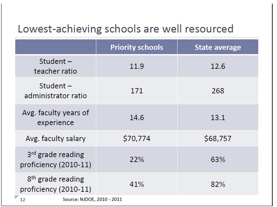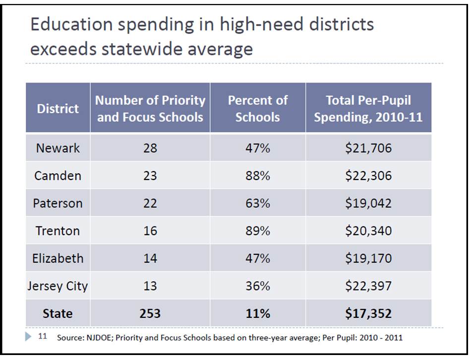 Indeed, New Jersey more than other states has put some money into these districts. See “Is school funding fair?” But, let’s be clear, these margins of funding difference, while helpful, hardly make these districts – given their needs – flush with excess resources!