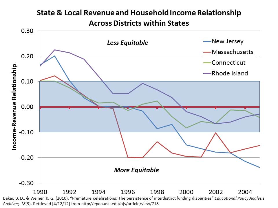I also elaborated in that previous that one key difference between these states is that NJ and MA, more than the others have shifted resources toward higher need districts. The first graph shows the disruption over time in the relationship between district income and district resources. MA and NJ have most significantly disrupted this relationship, providing systematically more resources per pupil in lower income districts.