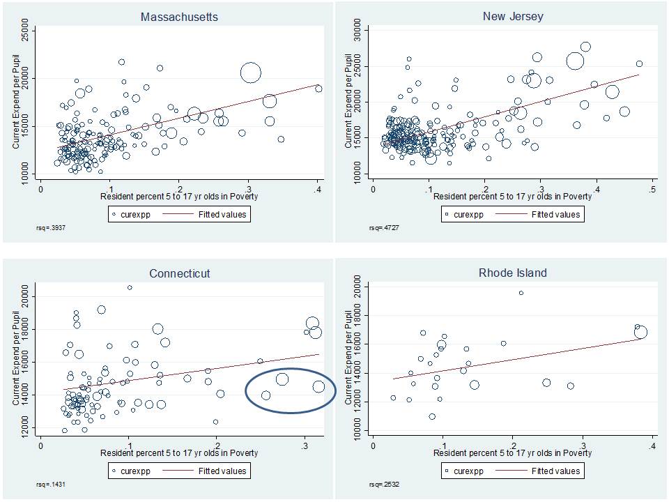 This second graph shows the pattern across districts by poverty in each state. Note that in CT, while a few high poverty districts (Hartford and New Haven) have higher current spending, the CT pattern is less systematic. Further, in those few districts, much of the additional spending is granted through magnet school aid, and thus may have limited positive impact on the districts’ neediest students.