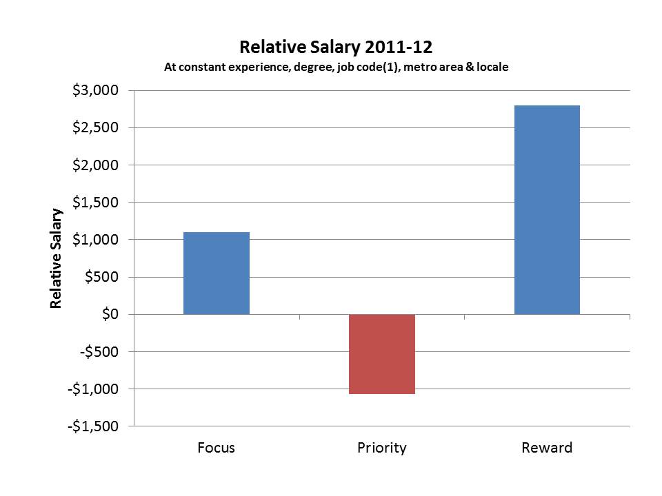 That is, I’m comparing apples with apples. This first graph shows the average difference in salary on the above comparison bases, statewide. Statewide, teachers in priority schools are earning a lower salary and teachers in reward schools a higher salary than teachers in “all other schools.” But these averages do mask some important differences across labor markets.