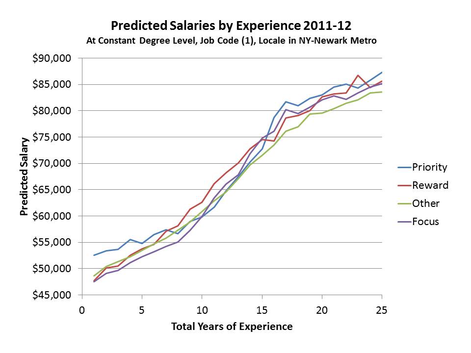 Here are the North Jersey/NY projected teacher salaries by experience level, where Newark carries significant weight in the model. Priority school salaries by experience are in blue, reward in red. On average, the differences are rather subtle. Reward schools salaries jump ahead in the mid-range, and priority rise again later, but fall behind in the mid range. But, it’s really important to understand, that simply having roughly the same salary does not mean that salary is actually competitive for recruiting and retaining teachers of comparable qualifications! In fact, to get teachers to work in a high need setting is likely to require a substantively higher wage!