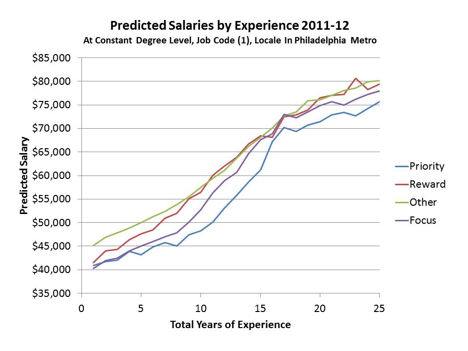 Now let’s look at south jersey, which appears to be the source of most of the deficit that shows up statewide. In South Jersey/Philly metro, teachers in priority schools are making a much lower wage especially in the mid-range. Non-classified and reward schools lead the way on salaries across most of the experience range. Hey… is this chicken or egg? Do salaries matter – or are more advantaged schools simply able to pay higher salaries.