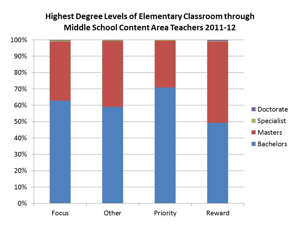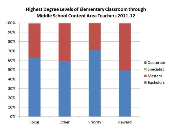 Here are the degree levels of classroom teachers in these schools – something notably absent in the NJDOE presentation. The differences between priority and reward schools are quite striking.