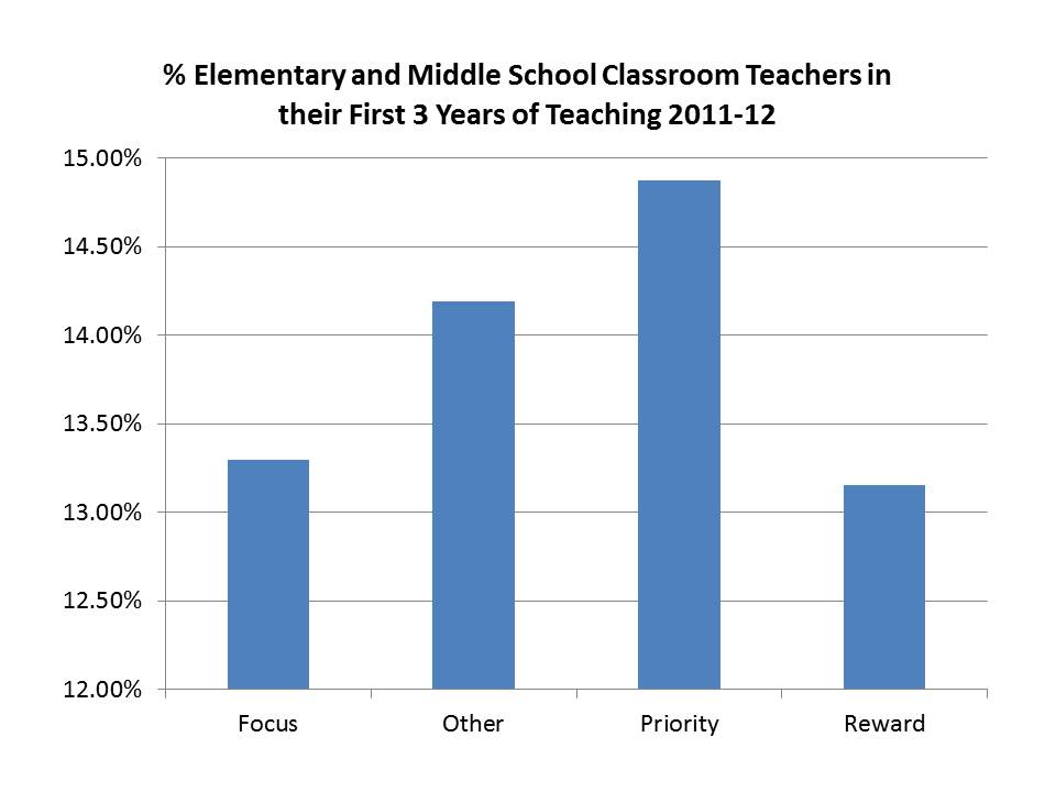 Finally, here are the concentrations of novice teachers, where a sizable body of research literature points to the problem of teacher churn in high need schools and the relationship between high novice teacher concentrations and lower student outcomes.