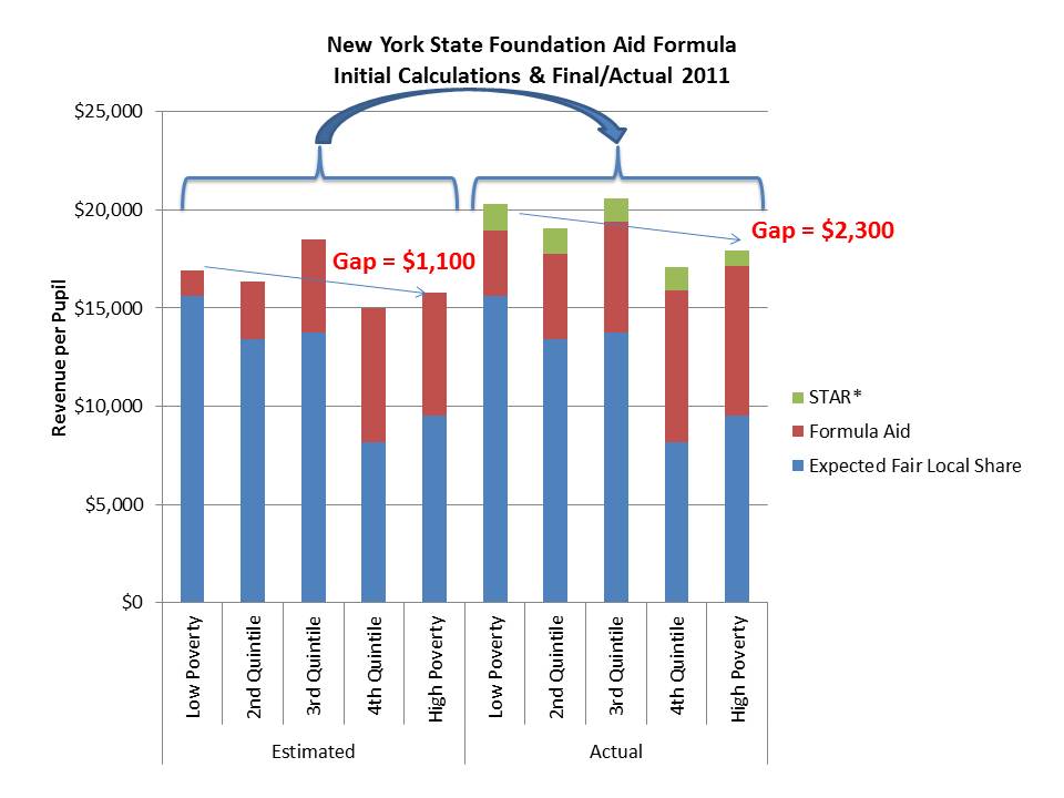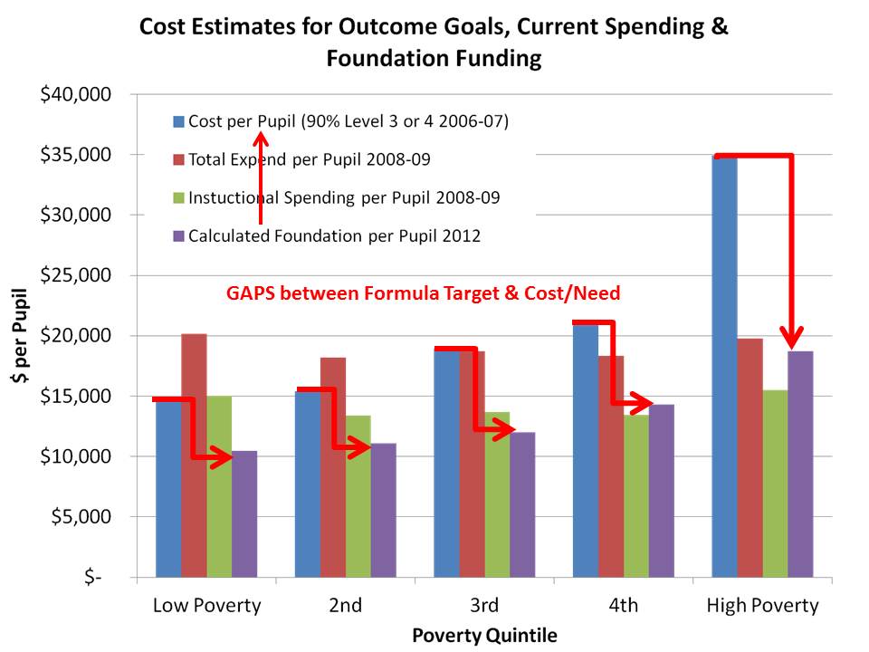 The blue bars come from a cost model produced a few years back by William Duncombe of Syracuse University in which he used that model to estimate the average spending actually required to achieve a 90% proficiency rate on state assessments (where the average had drifted over time, making the 80% standard relatively meaningless – again, see report). The red arrows show the gap between estimated costs of reasonable outcome goals and guaranteed funding under the foundation formula.