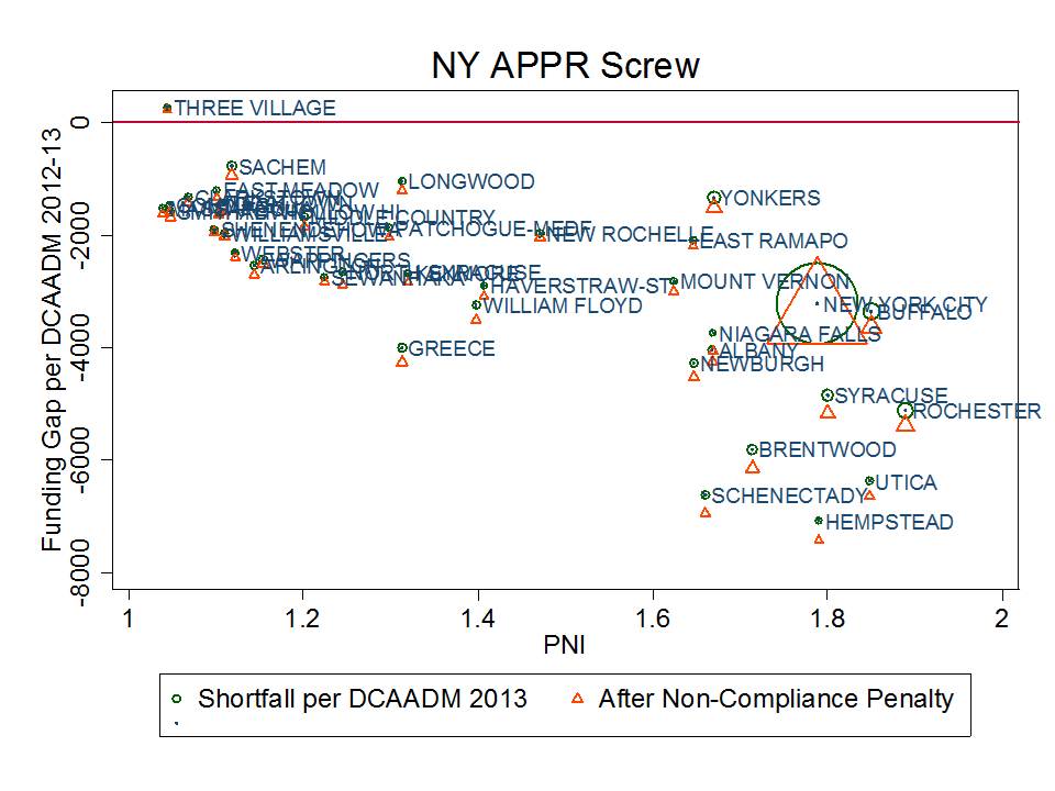 If nothing else, it is thoroughly obnoxious, arbitrary and capricious and grossly inequitable treatment. I hear the reformers (who understand neither math nor school finance) whine… But why… why is it inequitable to require similarly that poor and rich districts follow state teacher and principal evaluation guidelines. Setting aside the junk nature of that evaluation system and the bogus measures on which it rests (and the fact that the reformers’ fav-fab-charters have largely rightfully ignored the eval mandate), it is inequitable because districts serving higher poverty children stand to lose more money per child as a result of non-compliance. And they’ve already been squeezed.