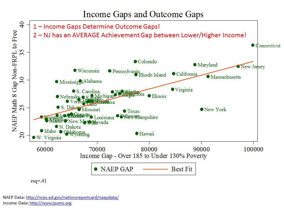 Most importantly, NJ’s gap is right on the line. That is, given its income gap, NJ falls right where we would expect- on the line. NJ’s income related achievement gap is right in line with expectations!