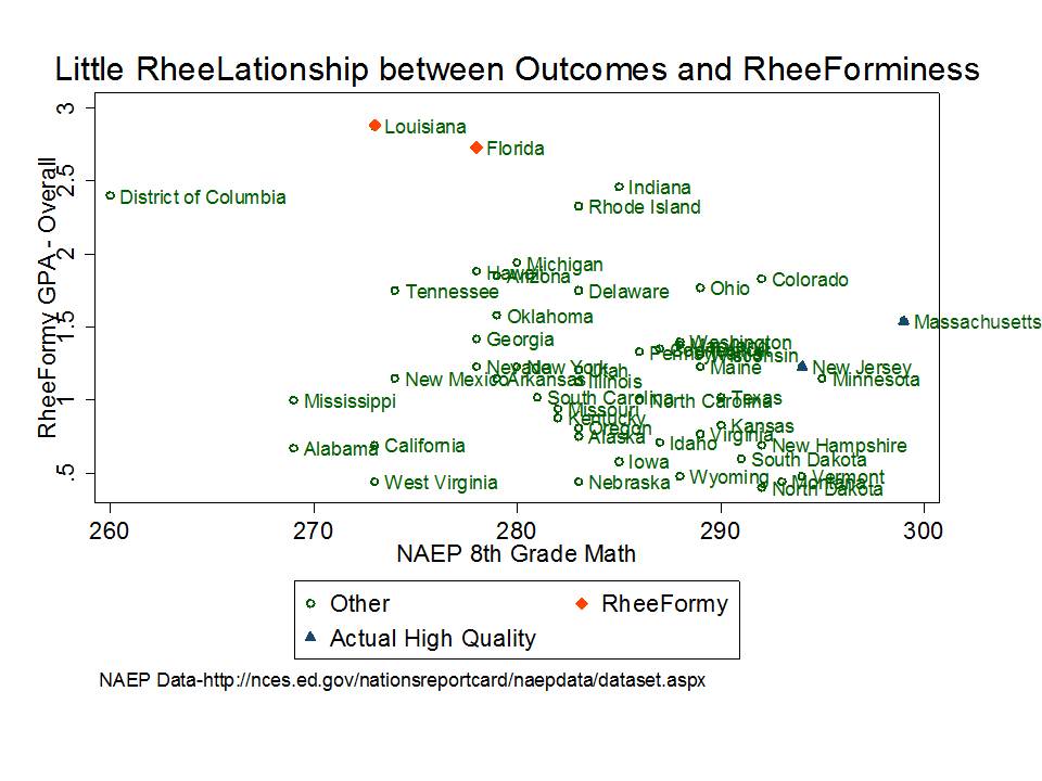 Next up are the RheeFormy ratings on elevating the teaching profession, where quite clearly, having competitive wages for teachers (relatively to the workforce of similarly educated workers) is a non-issue. Figure 3 shows the relationship between the relative weekly wage of teachers – compared to same education level non-teachers – and the elevating teaching GPA. Teachers in Louisiana have among the largest “teaching penalties” earning only about 70% of the weekly wage of non-teachers. That’ll certainly elevate the profession! They are right up there with other stellar reformy states including Colorado and Tennessee. Teachers in Florida do a bit better. Teachers in Massachusetts don’t do that well either, but Massachusetts is a state where non-teacher wages are quite high. So being relatively low in Massachusetts might not be as bad as being relatively low in Louisiana or Tennessee! (They also have the benefit of being able to send their own kids to pretty good public schools.) Teacher wages in New Jersey are more competitive, even in their higher non-teacher wage competitive context.