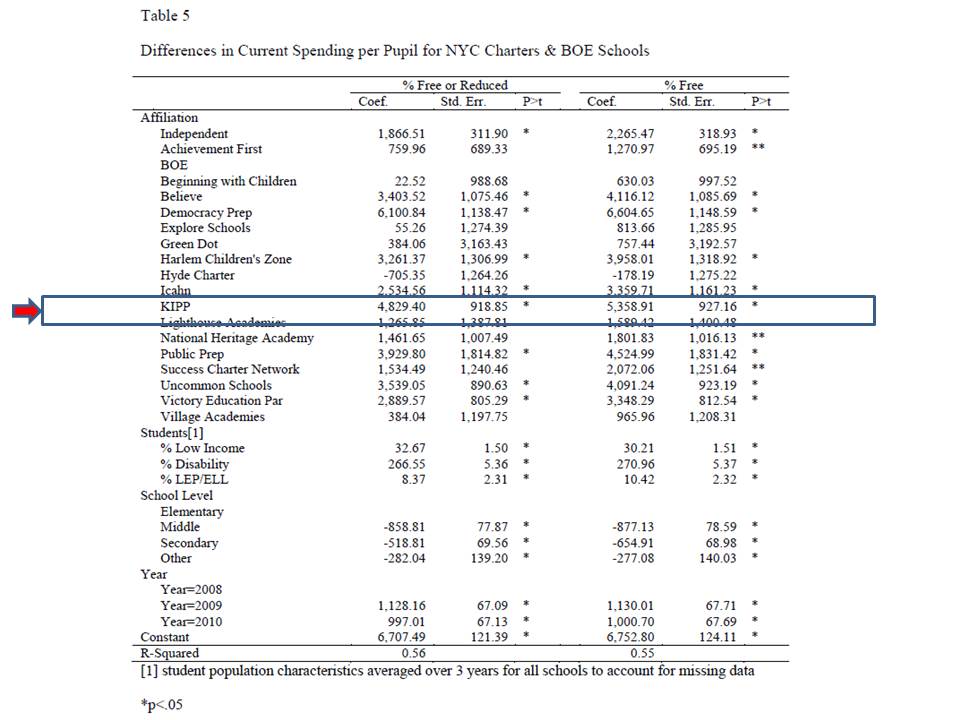 Table 5 shows the regression results comparing the site based spending per pupil of charters by affiliation, with New York City district schools serving similar populations, the same grade levels and in the same borough. When comparing by % free or reduced lunch, where KIPP schools are more similar to their surroundings, KIPP schools spent about $4,800 more per pupil. When comparing by % free lunch alone, where KIPPs have lower rates than many surrounding schools, KIPP schools spent more than $5,000 more per pupil.