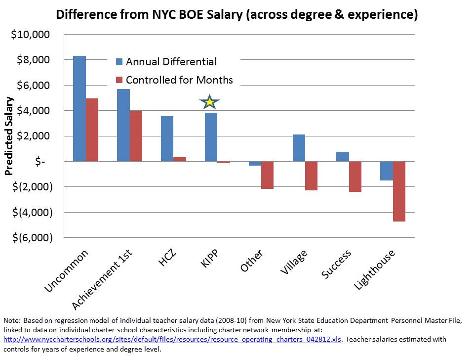 This figure shows the relative salaries of teachers, both on an annual basis and equated for months on contract in New York City. KIPP teachers at same degree and experience level were paid about $4,000 more than district teachers. Equating contract months KIPP teachers were paid about the same as district teachers. But the central point here is that KIPP teachers were paid more for the additional time. That said, it would appear that teachers in some other NYC charters were paid even more than KIPPs at same degree and experience level.