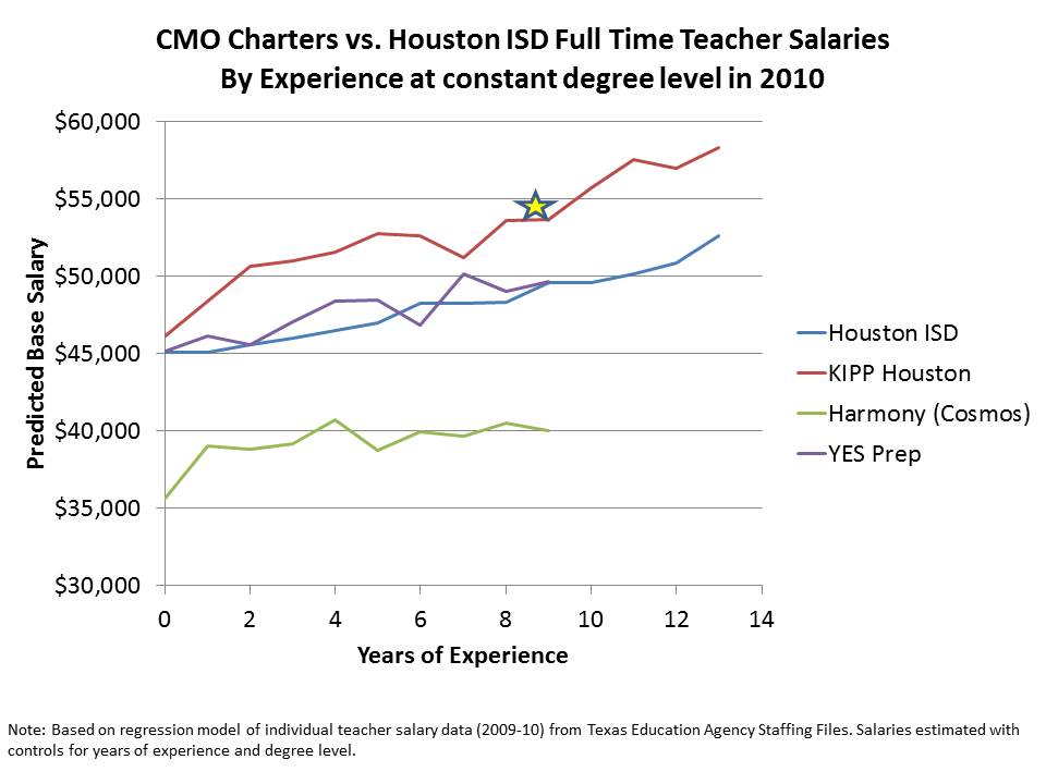 Here’s a plot of teacher salaries by experience level in Houston Texas. KIPP teachers across the range of experience receive a substantial salary premium for their time and effort.