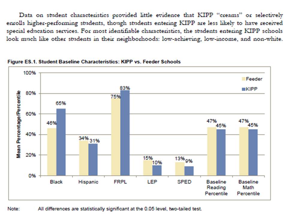 There was one point in reading the KIPP report that my head almost exploded. This was where the authors of the report included a ridiculously shoddy analysis in order to brush off claims of cream-skimming. In figure ES.1 of the report, the authors make the argument that it is clear that KIPP schools are not cream-skimming more desirable students by comparing KIPP student characteristics to those of all students in the schools from whence the KIPP students came.