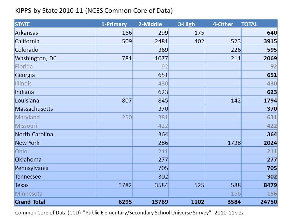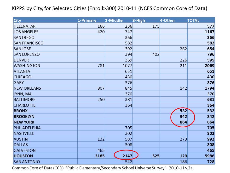 Note that Houston and New York are non-trivial shares of the total KIPP sample. Here’s my run of KIPPs by state and by major city, using the NCES Common Core of Data 2010-11.