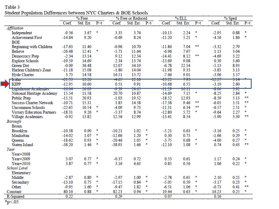 Finally, I’ve not in my post suggested that these caveats negate entirely the KIPP effect. I’d like to see it parsed more carefully, especially by market… given the current approach assumes a counterfactual of a monolithic public schooling alternative from Houston, to NOLA to NYC to Boston, and thus also assumes (the study doesn’t but the pundit response certainly does) scalability of the treatment to be similar across these vastly disparate settings (even though we don’t even know if the schools were comparably effect in all). Does access to higher quality teacher labor in a given market matter? Or is their recruitment sufficiently national? How did the relative performance of the public system affect the likelihood that KIPPs could show advantage? it might be easier to beat the odds in California than in other locations. it might be easier to beat the odds in CA or NOLA, even with needier students than the district schools, given the KIPP resource advantage. But, it may be harder to beat the odds in NYC or Boston. Not sure. Creamskimming, peer effect & selective attrition may play some role here along with substantial resource advantage. Study unhelpful in this regard. I understand that this was probably the charge given to MPR by funders – study overall KIPP effect – don’t disaggregate in ways that might reveal specific school performance.
