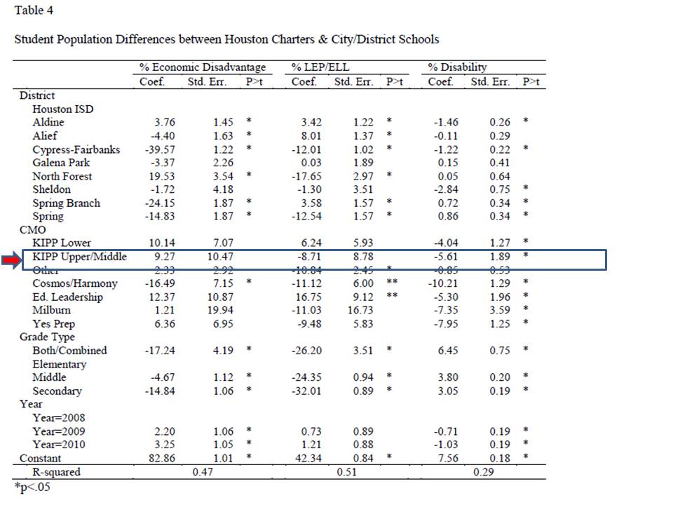 Ed — quick question. Your chart shows that kids entering KIPP in 5th grade in Texas had 4th grade math scores that were .051 standard deviations higher than their peers, not very much. But then Table 5 breaks this down into “all students” vs. “economically disadvantaged” students, the latter of whom were supposedly scoring fully .26 standard deviations higher in 4th grade math before they got to KIPP.