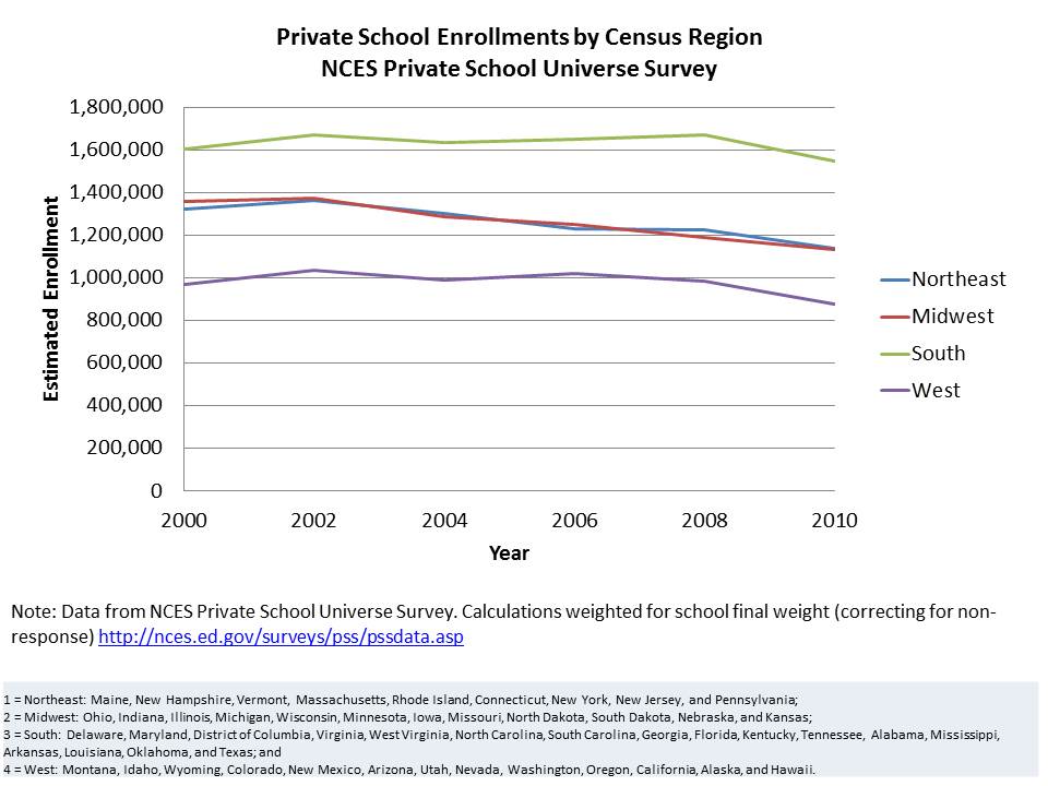I hate to read too much into data that are still this aggregated. Some of the other issues I raised are more easily empirically explored – for example, the shifting enrollments from urban catholic to charter schools – if that’s really happening. I did have a doc student back at Kansas look into the shifting cost structure of Catholic high schools… reduction of in-kind/church funded staff. There’s much to be explored here.