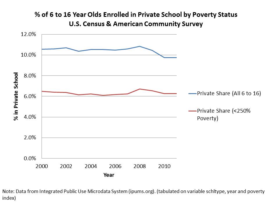 Now, let’s take a look at Census Bureau data from 2000 to 2011, including a breakout of children from lower income families (those below 250% of the income level for poverty). Here, I look at 6 to 16 year olds because, in states where kindergarten is half-day, larger shares attend private schools, and where full day kindergarten increases by policy change, private school shares decline. Here I’m trying to capture the core of the school aged population.