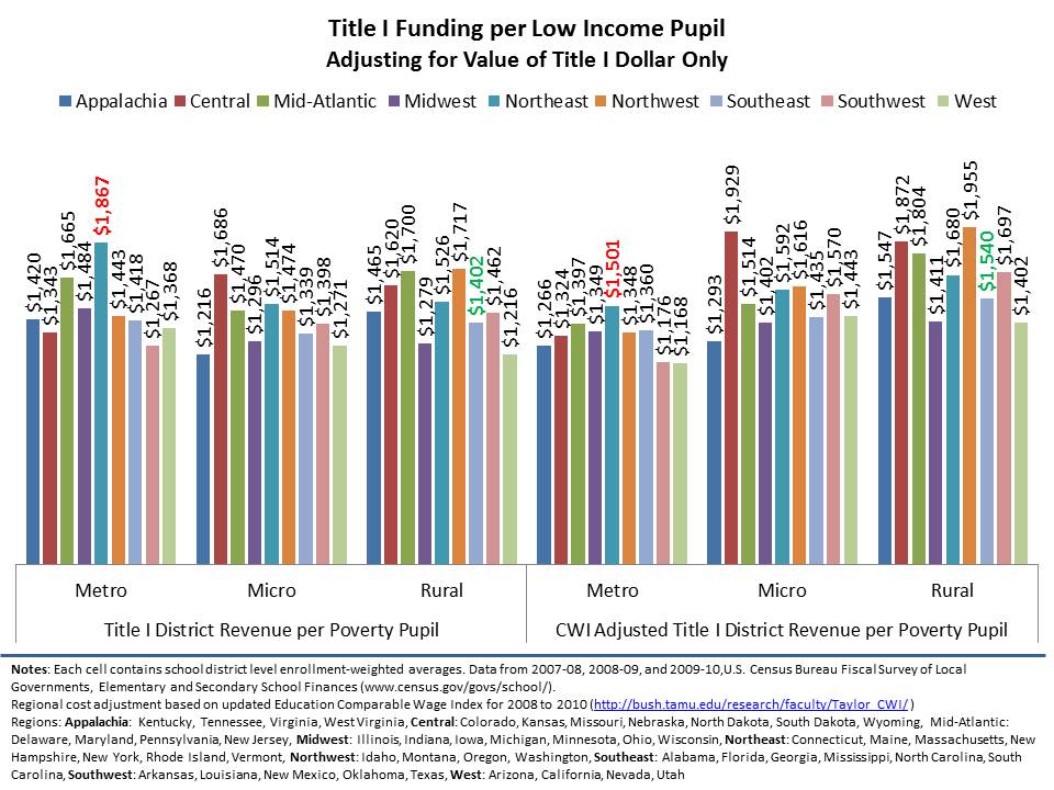 In short, Title I funding DOES NOT ADVANTAGE WEALTHY, NORTHEASTERN, METROPOLITAN AREAS! That is, not when one more accurately measures both the value of the education dollar and the expected numbers of children in need.