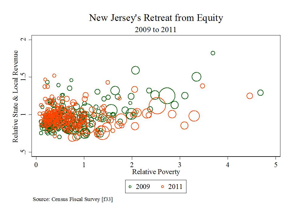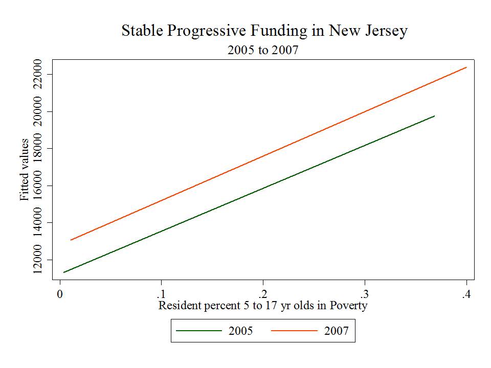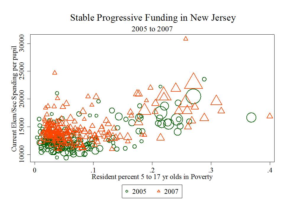 The damage done is rather striking and far beyond what I ever would have expected to see in these data. It may be that there are problems in the data themselves, but separate analyses of the revenue and expenditure data and use of alternative enrollment figures thus far have produced consistent results. In fact, analyses using state and local revenue data look even worse for New Jersey. And these charts do not adjust for various cost factors. They are what they are (variable ppcstot, or per pupil current spending, with respect to census poverty rates).