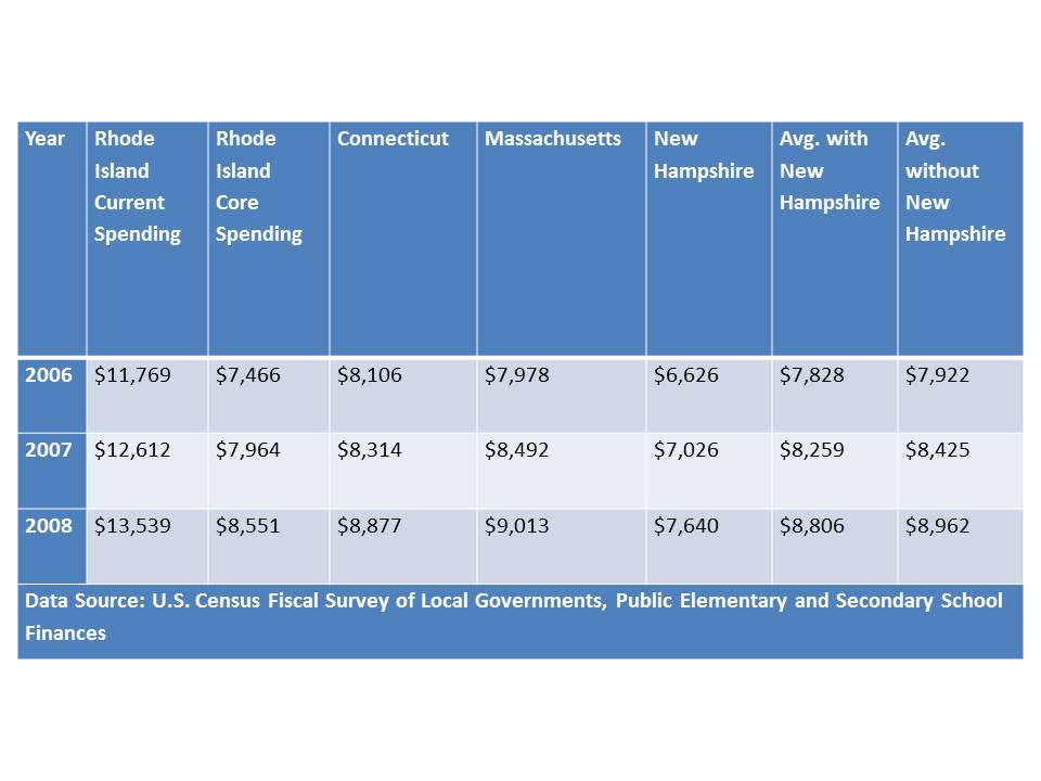 - That like New York officials, Rhode Island officials chose to focus on a reduced spending figure – core instructional spending – rather than a complete current operating spending figure.