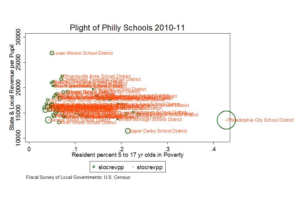 First, here is the state and local revenue per pupil for Pennsylvania school districts in the Philly metro area with respect to poverty.