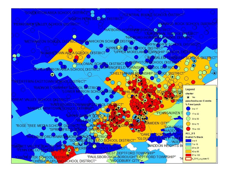 Now, let’s take a quick look at the patterns of “chartering” that have occurred by 2011. Charters have a little star on them. Sorry, no gold star. I’m not in the business of handing those out. First of all, we see that charters only exist in districts with more black students and more low income schools. Charters aren’t flourishing in the Philly ‘burbs, like Lower Merion! (that’s because they must have “great” schools!?).
