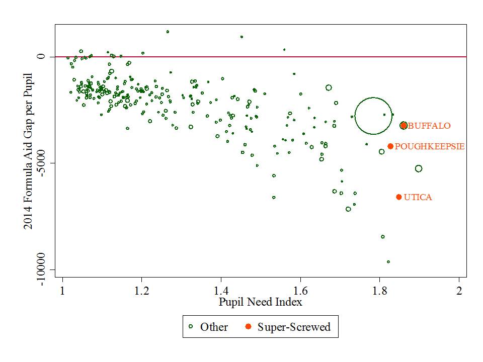 This first figure shows the size of the average STATE AID TARGET GAPS – or amount per pupil that the good Gov’ Cuomo has deprived these children of – for the 2013-14 school year. Notably, the state aid shortfalls- the amount the state underfunds its own formula – grow bigger and bigger as the state’s own pupil need index goes higher and higher. The huge bowling ball here is New York City. I’ve have noted a few standouts from past posts, including Utica and Poughkeepsie, and I’ve include Buffalo here because it seemed to have been the target of the death penalty comments.